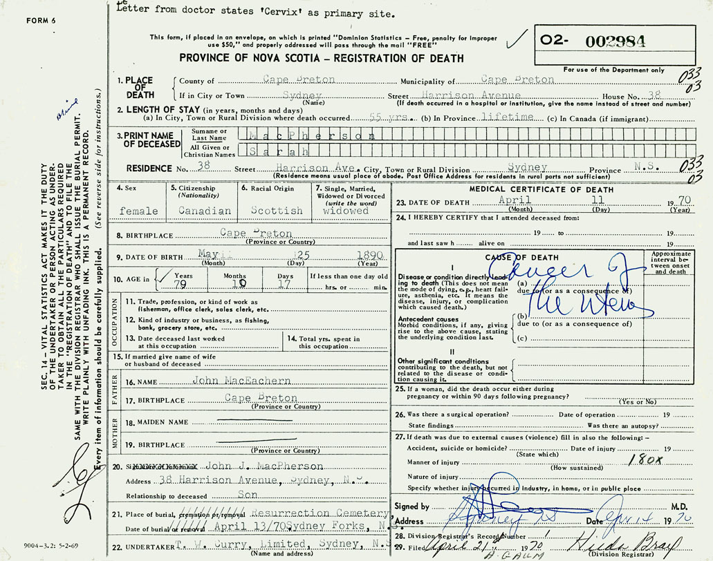 1. PLACE OF DEATH County of Cape Breton If in City or Town Sydney