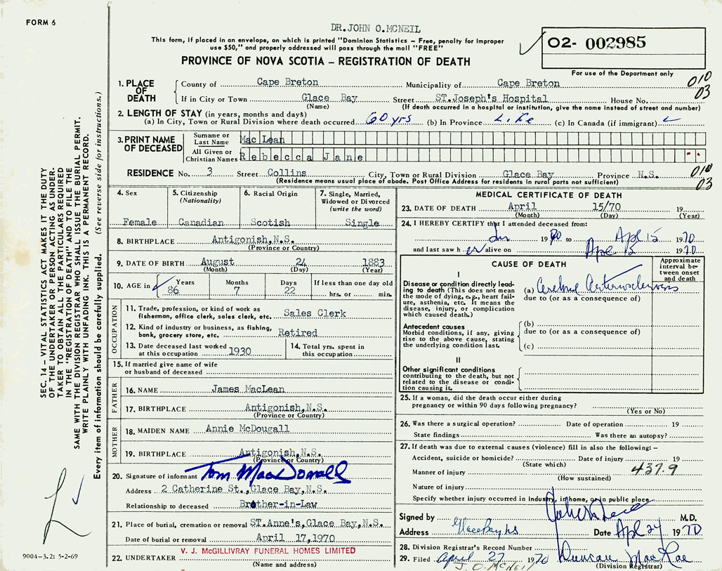 1. PLACE OF DEATH County of Cape Breton If in City or Town Glace Bay