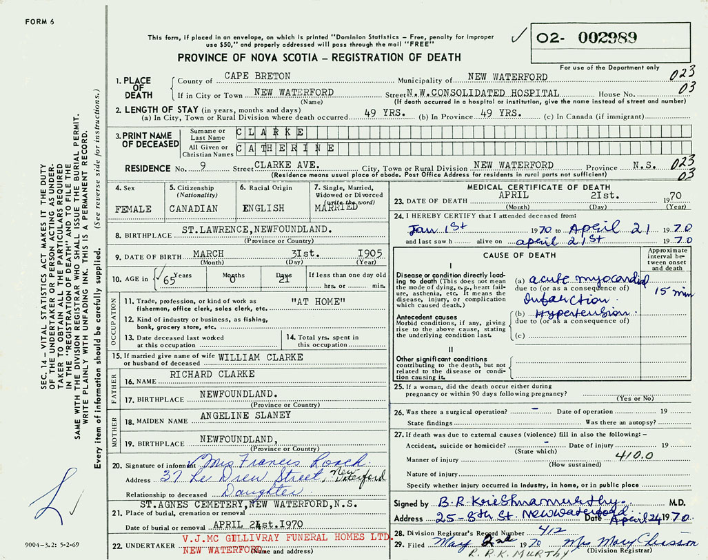 PROVINCE OF NOVA SCOTIA — REGISTRATION OF DEATH