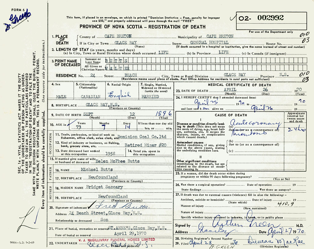 21. Place of burial St. Anne's, Glace Bay
