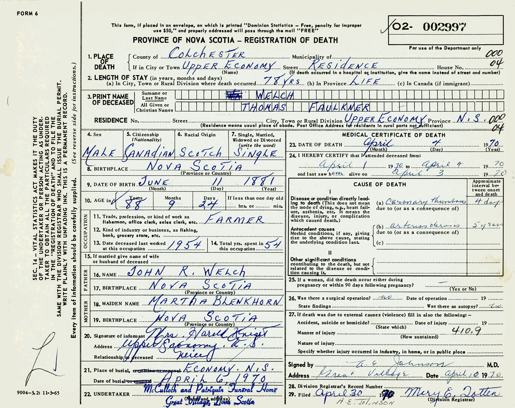 PROVINCE OF NOVA SCOTIA — REGISTRATION OF DEATH