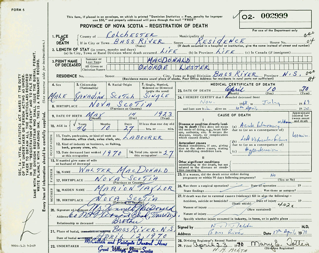 PROVINCE OF NOVA SCOTIA — REGISTRATION OF DEATH