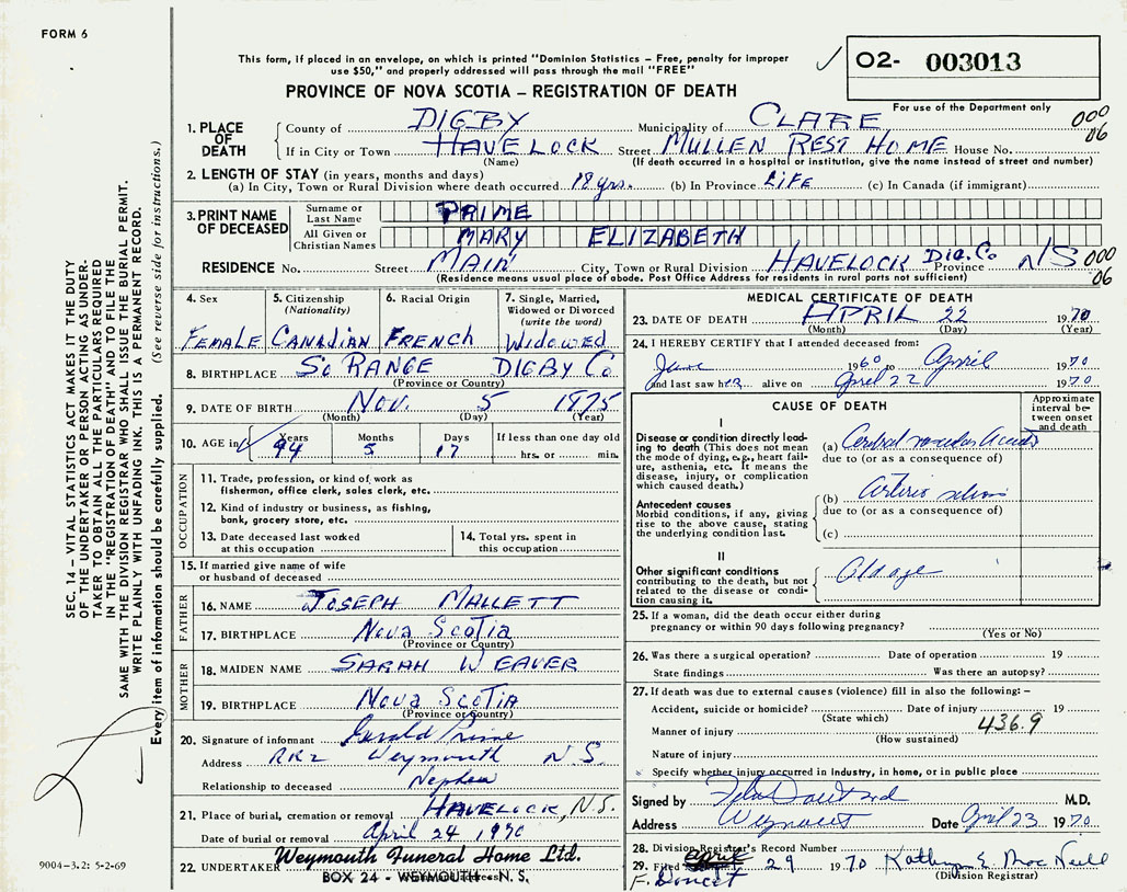 1. PLACE OF DEATH County of Digby If in City or Town Havelock