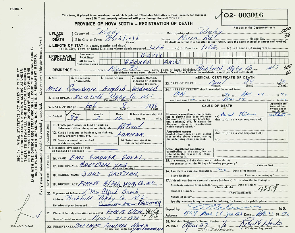 PROVINCE OF NOVA SCOTIA — REGISTRATION OF DEATH