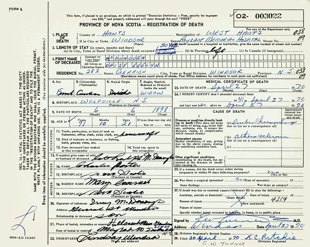 1. PLACE OF DEATH County of Hants If in City or Town Windsor