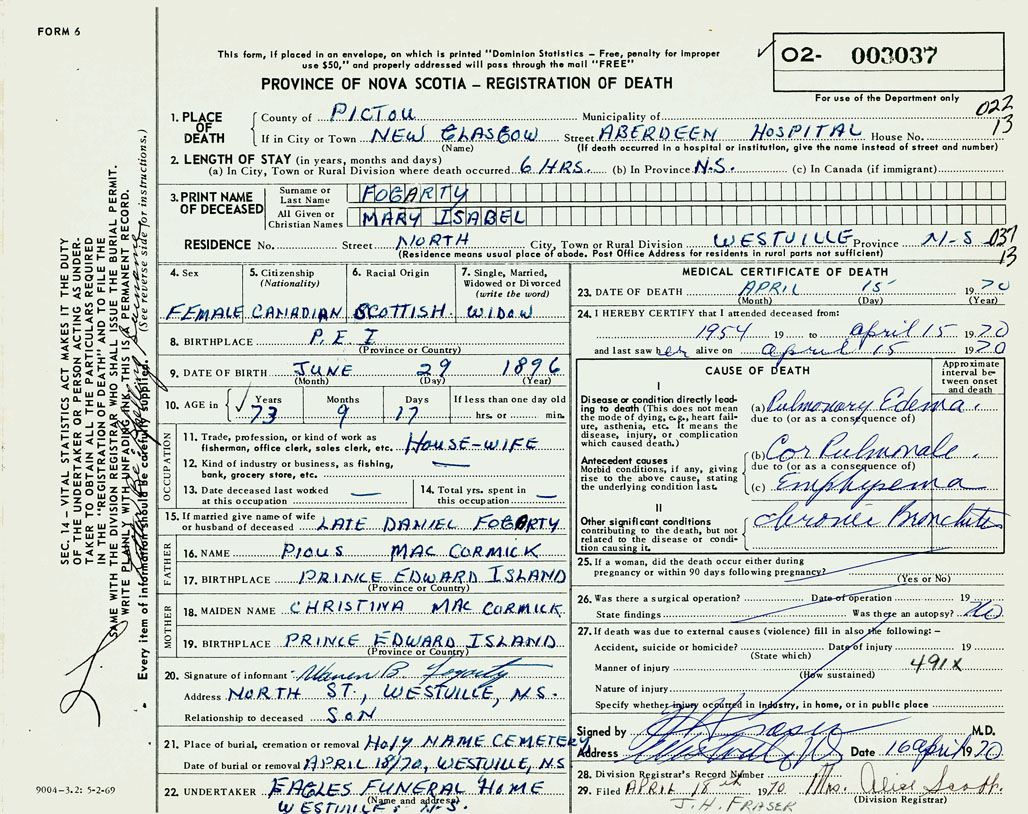 1. PLACE OF DEATH County of Pictou If in City or Town New Glasgow
