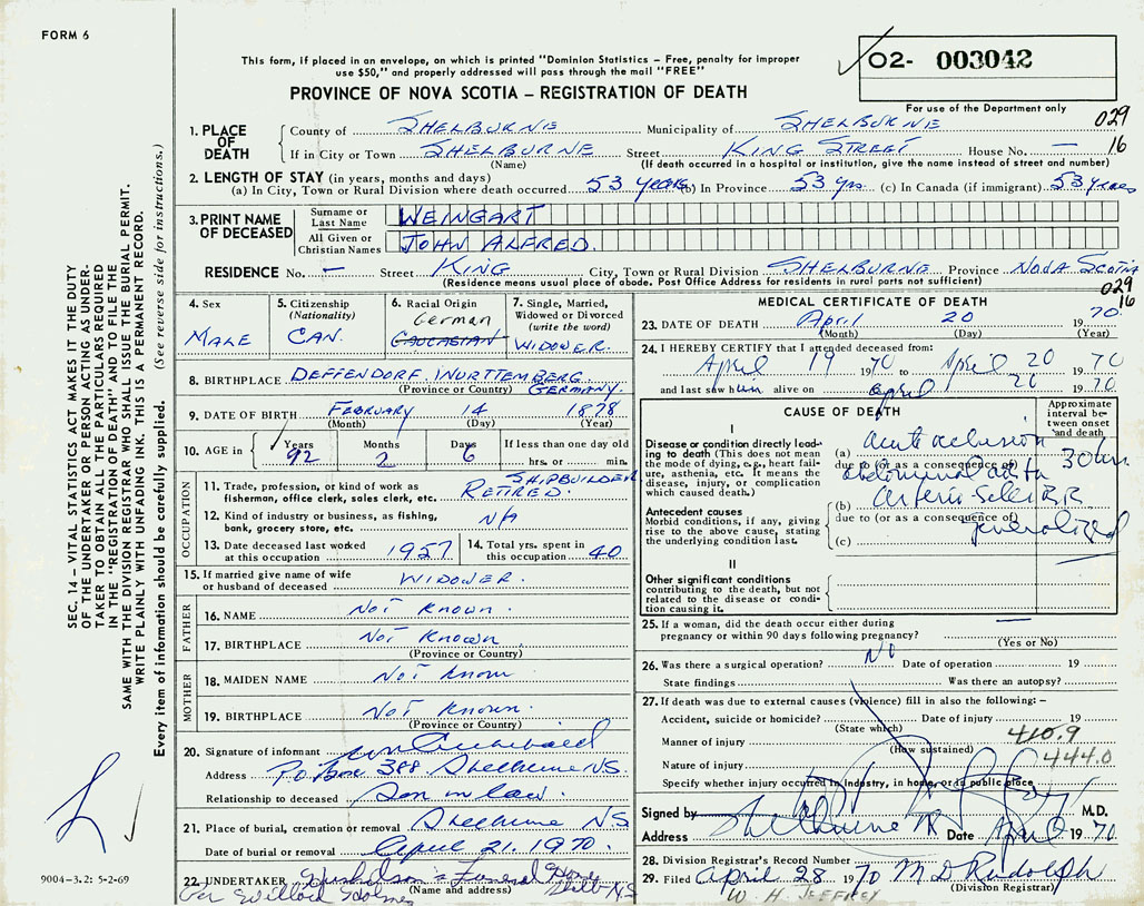 PROVINCE OF NOVA SCOTIA — REGISTRATION OF DEATH