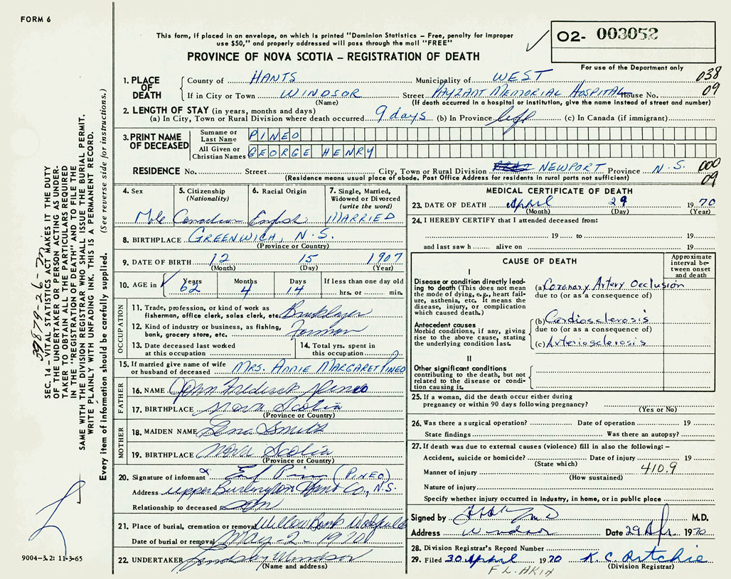 3. PRINT NAME OF DECEASED Pineo, George Henry