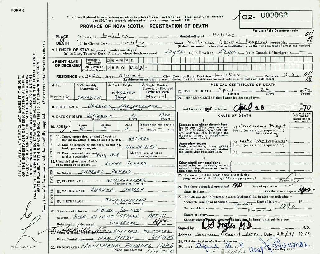 PROVINCE OF NOVA SCOTIA — REGISTRATION OF DEATH