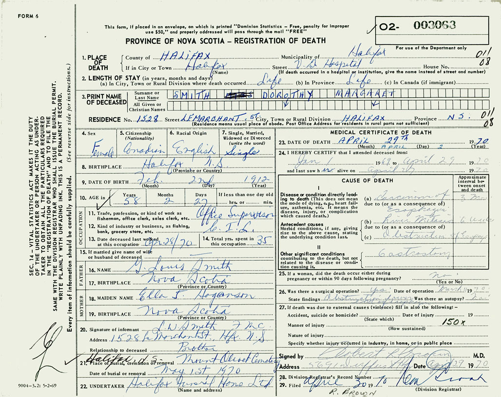 PROVINCE OF NOVA SCOTIA — REGISTRATION OF DEATH