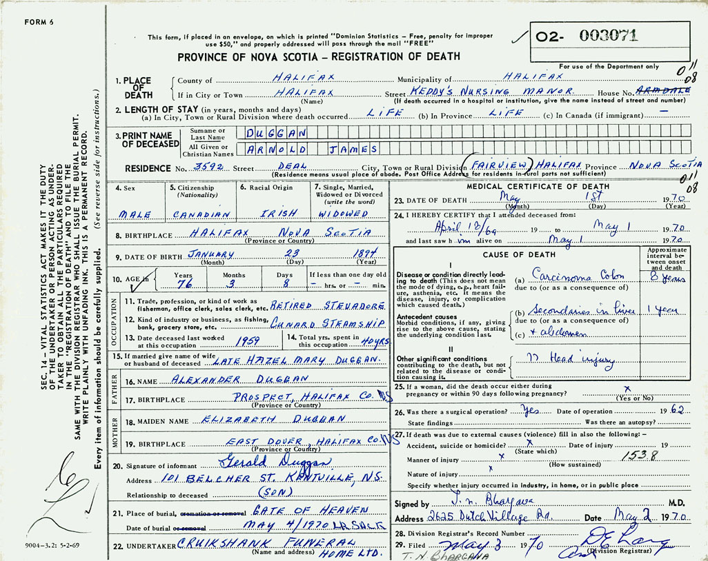 PROVINCE OF NOVA SCOTIA — REGISTRATION OF DEATH