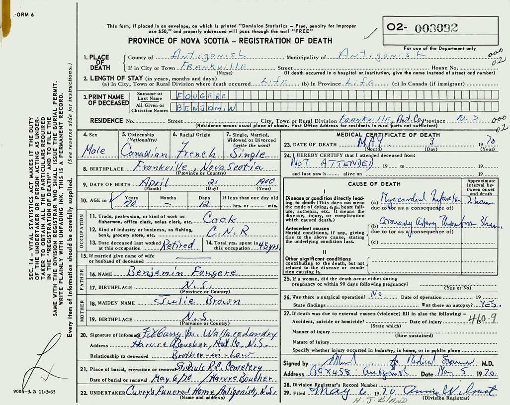 1. PLACE OF DEATH County of Antigonish If in City or Town Frankville