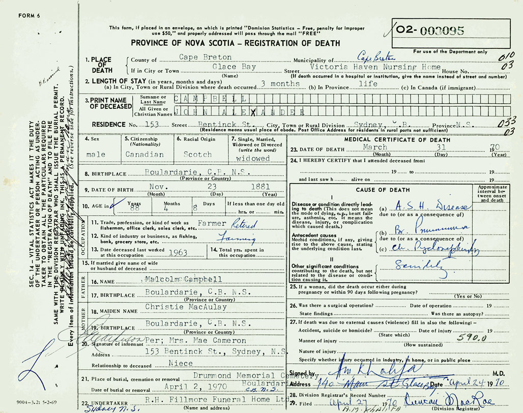 1. PLACE OF DEATH County of Cape Breton If in City or Town Glace Bay