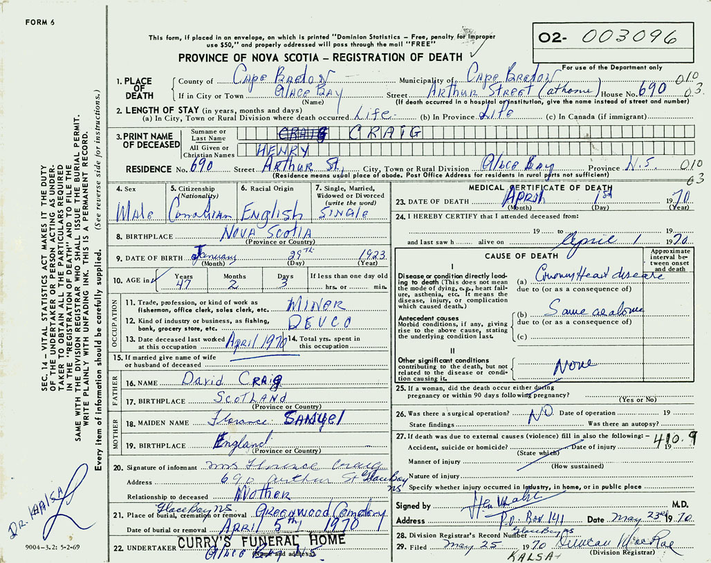 21. Place of burial Greenwood Cemetery, Glace Bay