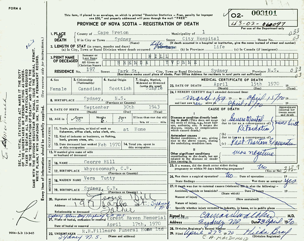 1. PLACE OF DEATH County of Cape Breton If in City or Town Sydney