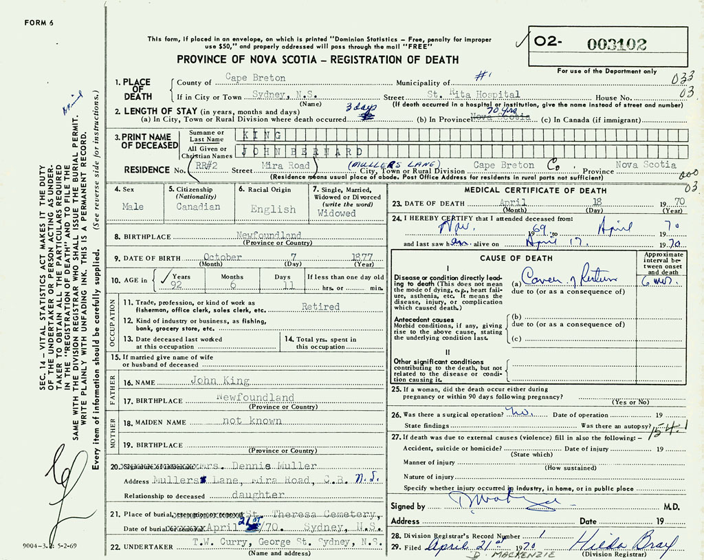 1. PLACE OF DEATH County of Cape Breton If in City or Town Sydney