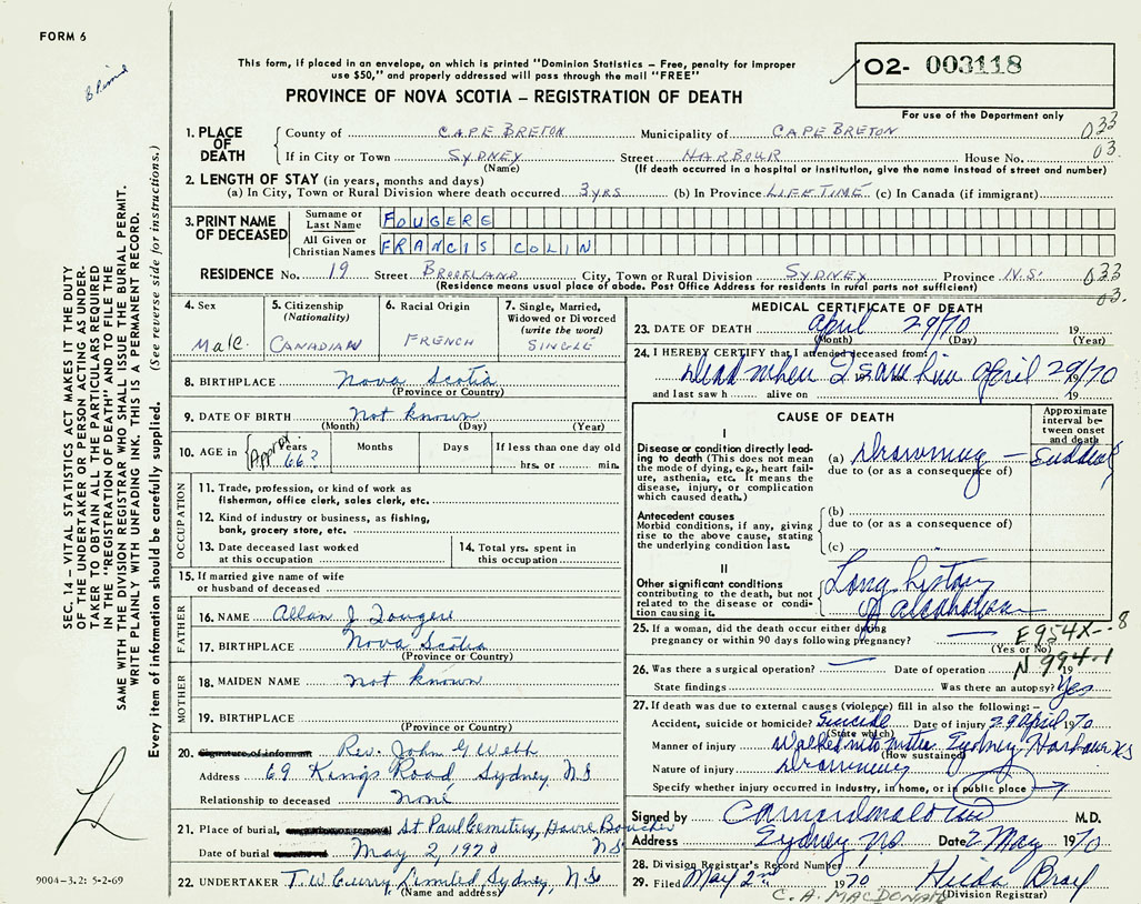 PROVINCE OF NOVA SCOTIA — REGISTRATION OF DEATH