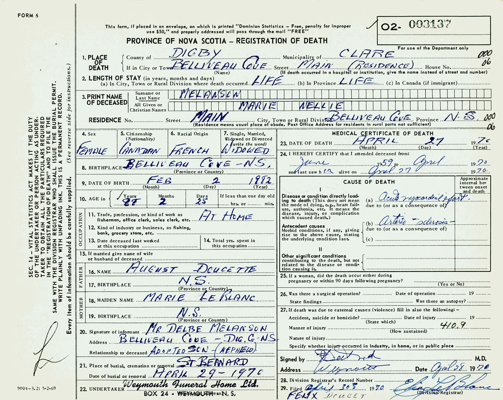 1. PLACE OF DEATH County of Digby If in City or Town Belliveaus Cove