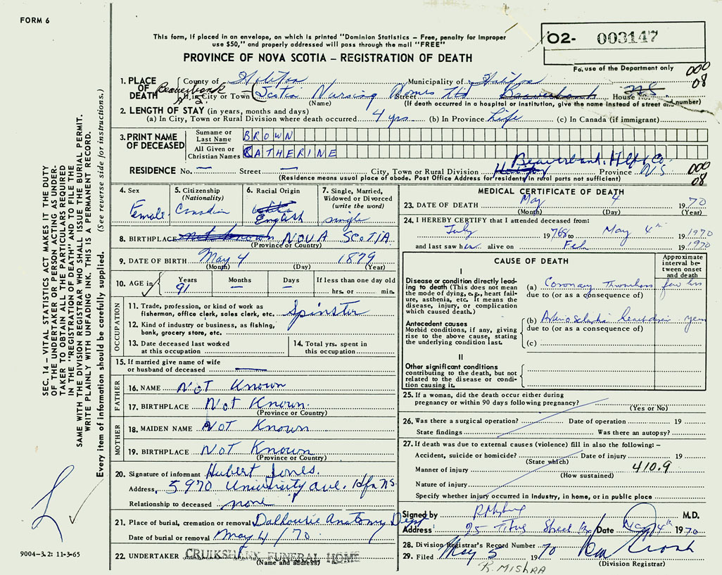 PROVINCE OF NOVA SCOTIA — REGISTRATION OF DEATH