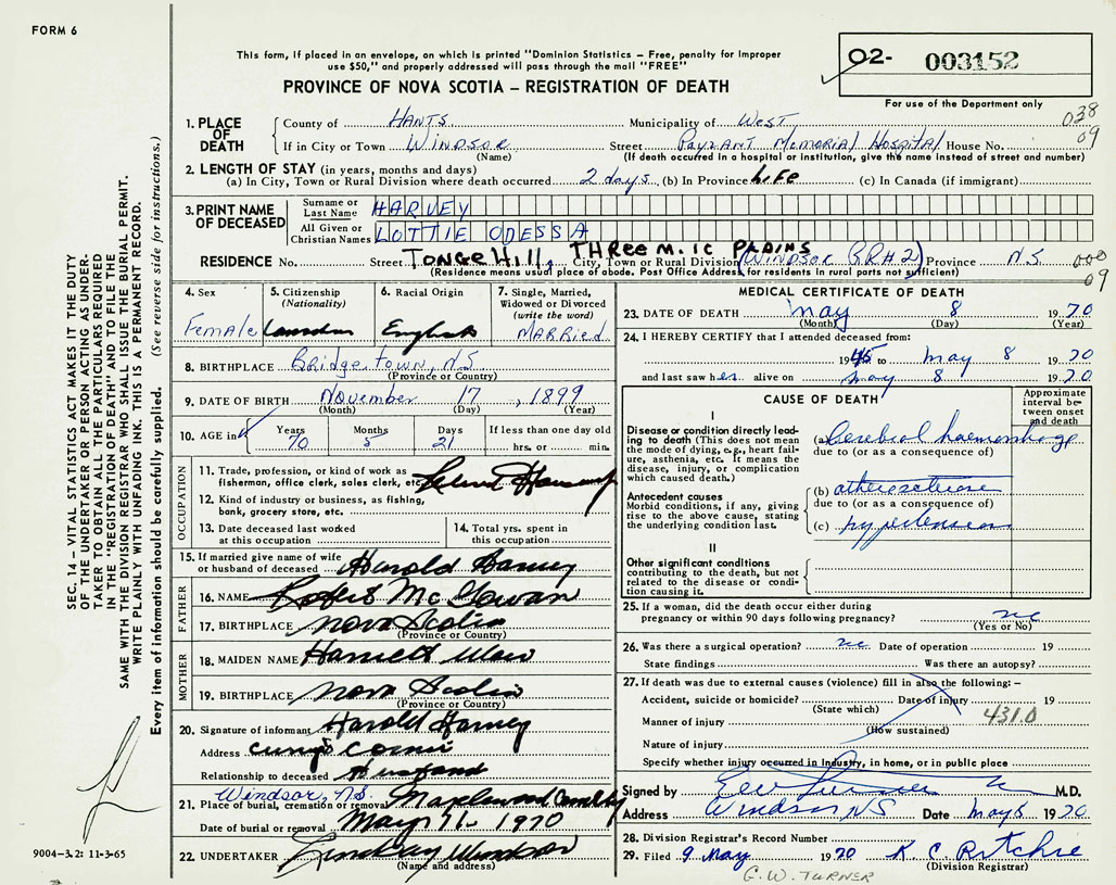 1. PLACE OF DEATH County of Hants If in City or Town Windsor