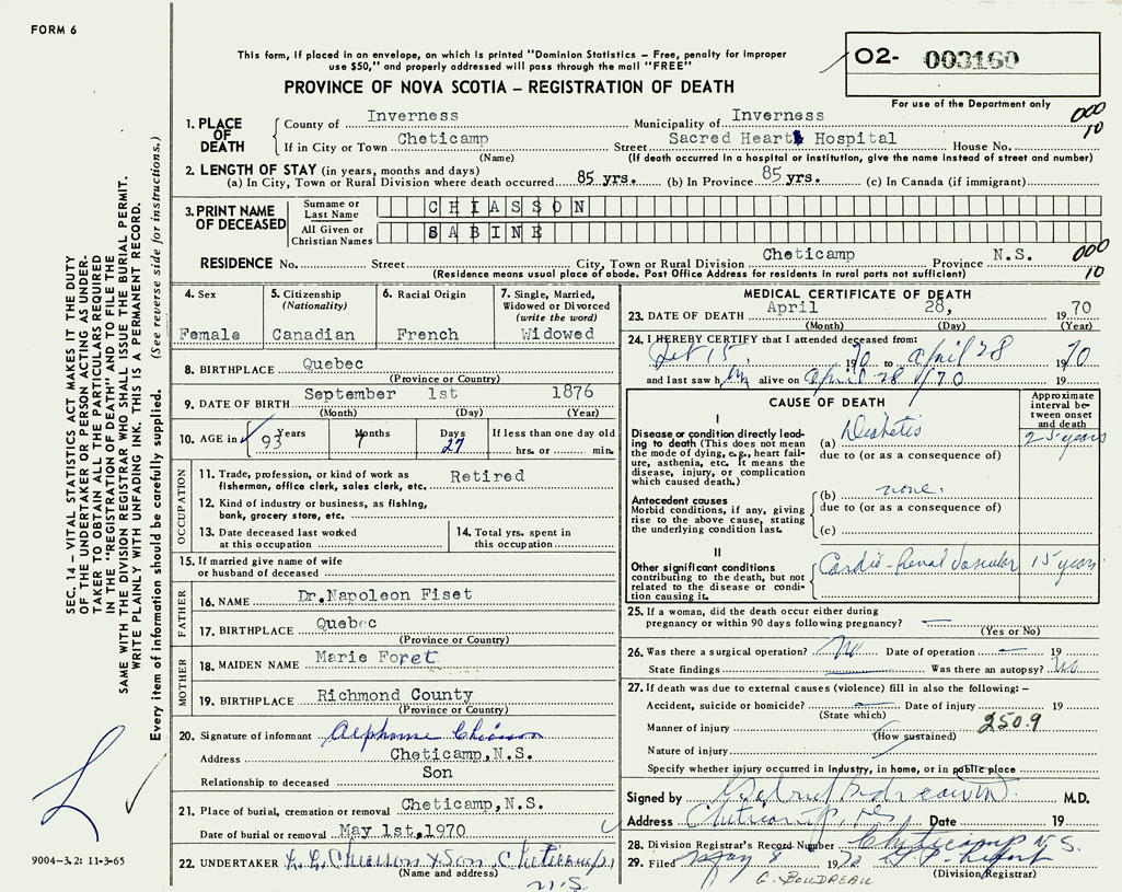 1. PLACE OF DEATH County of Inverness If in City or Town Cheticamp