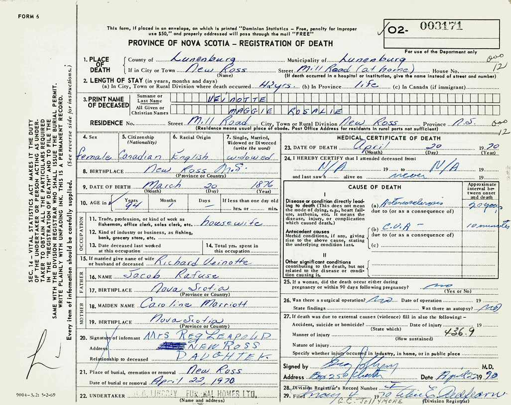 1. PLACE OF DEATH County of Lunenburg If in City or Town New Ross