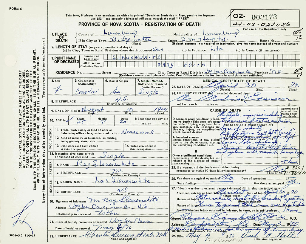 PROVINCE OF NOVA SCOTIA — REGISTRATION OF DEATH