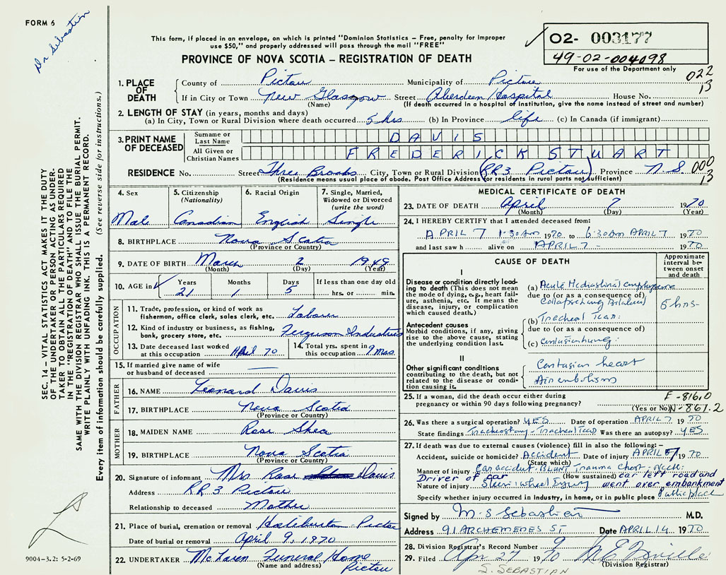 PROVINCE OF NOVA SCOTIA — REGISTRATION OF DEATH