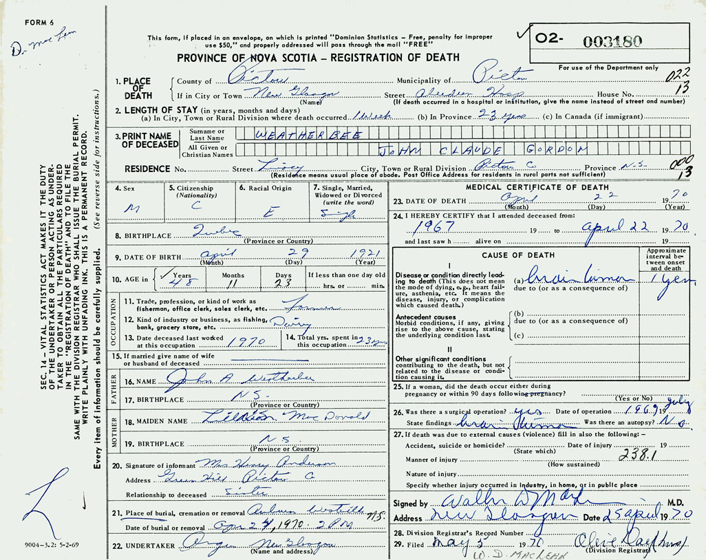 PROVINCE OF NOVA SCOTIA — REGISTRATION OF DEATH