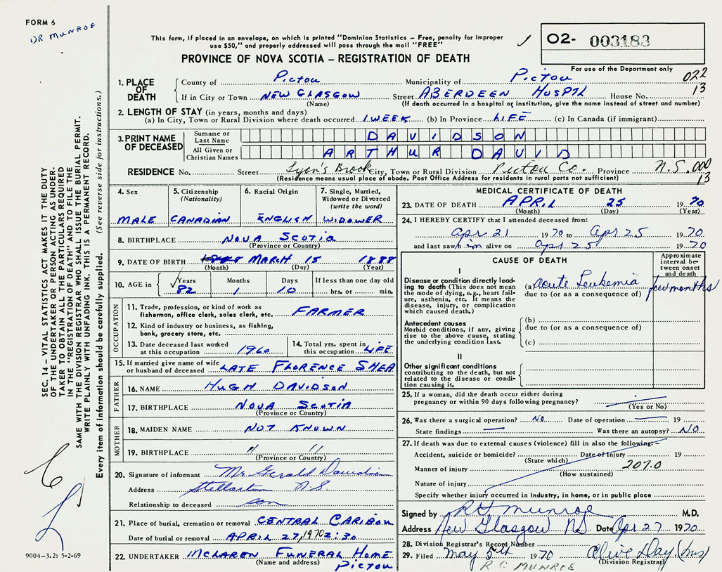 PROVINCE OF NOVA SCOTIA — REGISTRATION OF DEATH
