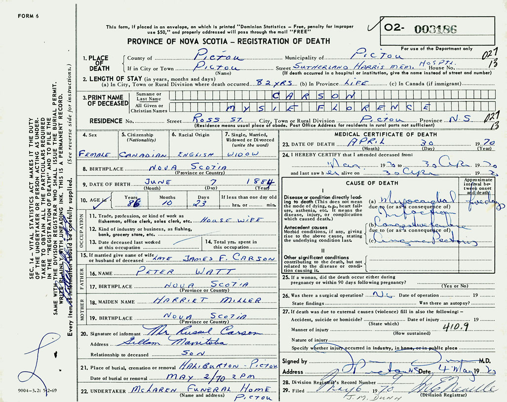 1. PLACE OF DEATH County of Pictou If in City or Town Pictou