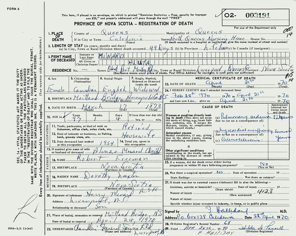 PROVINCE OF NOVA SCOTIA — REGISTRATION OF DEATH