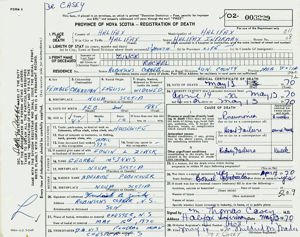 PROVINCE OF NOVA SCOTIA — REGISTRATION OF DEATH
