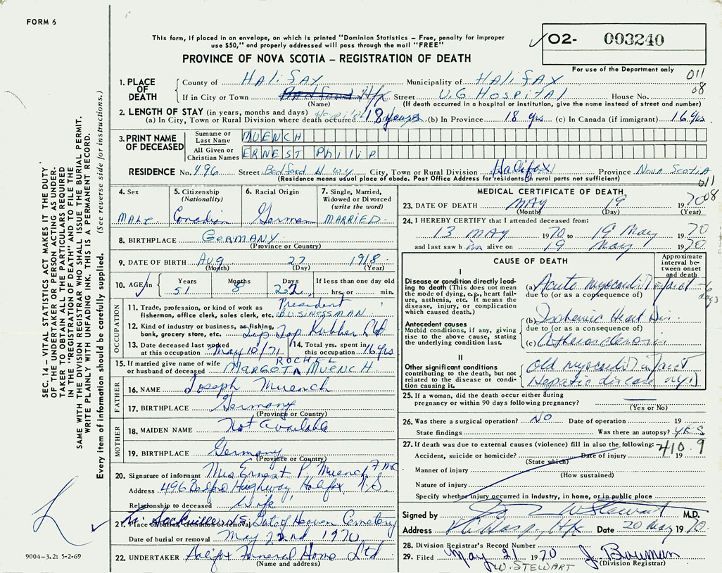 PROVINCE OF NOVA SCOTIA — REGISTRATION OF DEATH