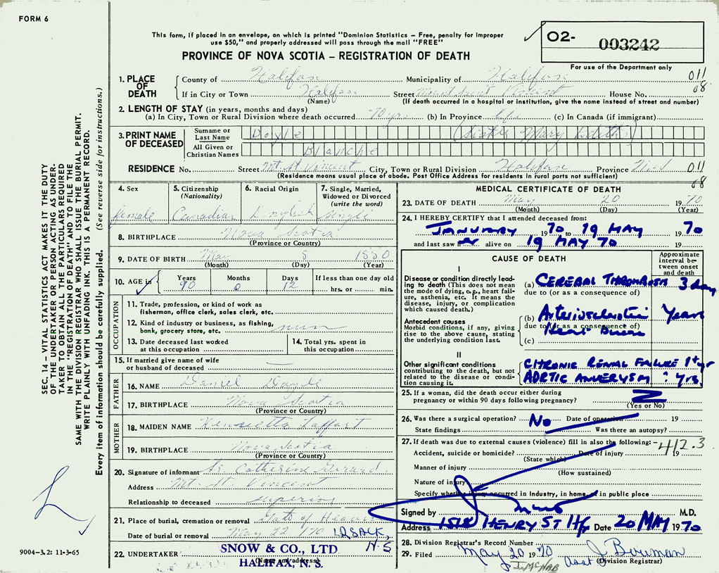 PROVINCE OF NOVA SCOTIA — REGISTRATION OF DEATH