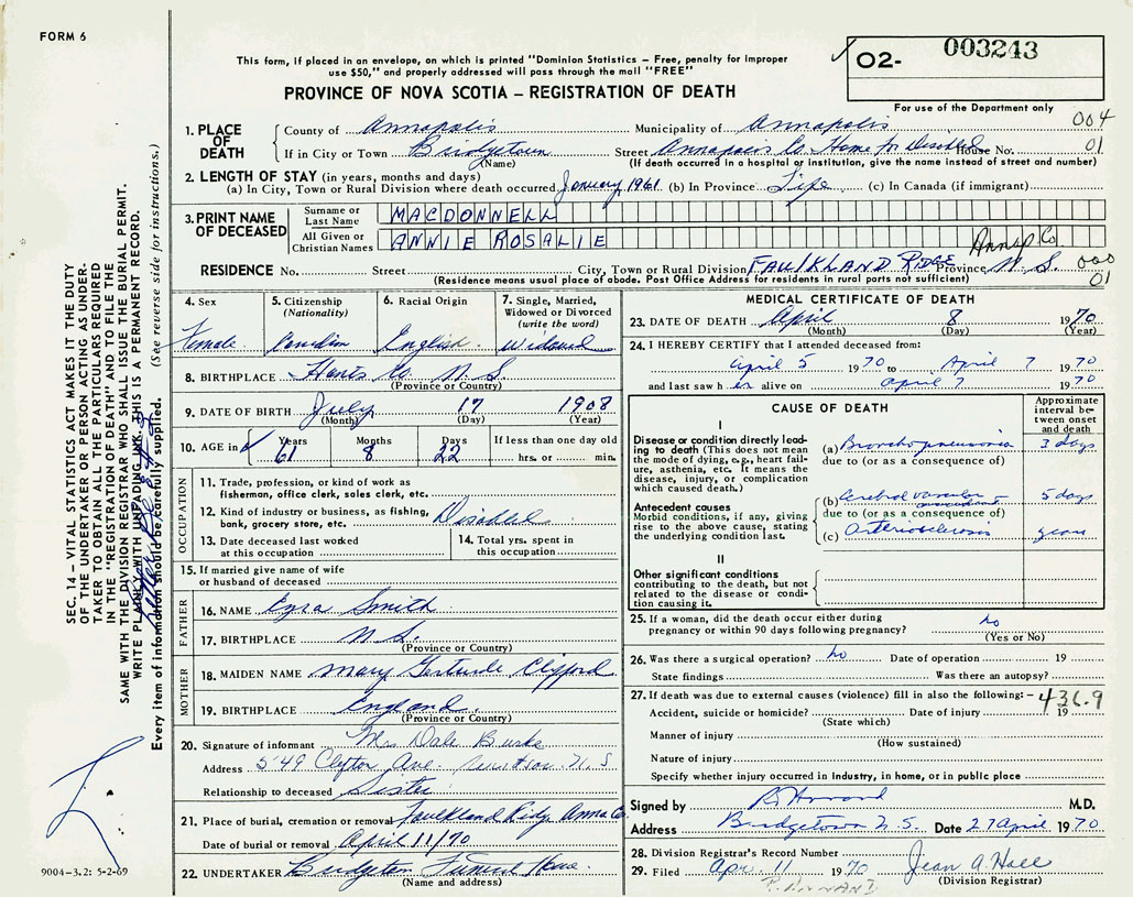 PROVINCE OF NOVA SCOTIA — REGISTRATION OF DEATH