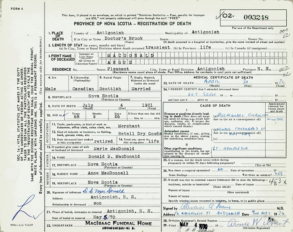 1. PLACE OF DEATH County of Antigonish If in City or Town Doctors Brook