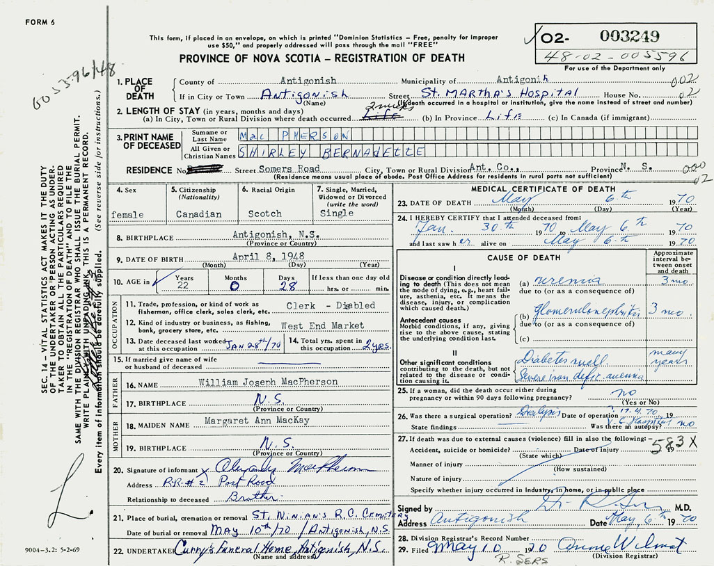 1. PLACE OF DEATH County of Antigonish If in City or Town Antigonish