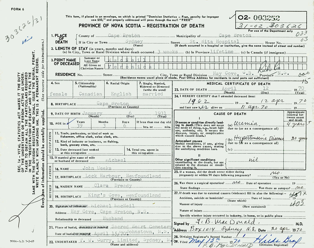 1. PLACE OF DEATH County of Cape Breton If in City or Town Sydney