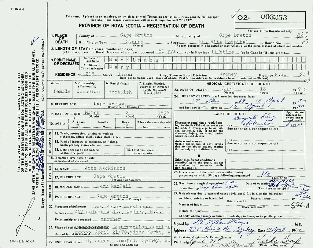1. PLACE OF DEATH County of Cape Breton If in City or Town Sydney