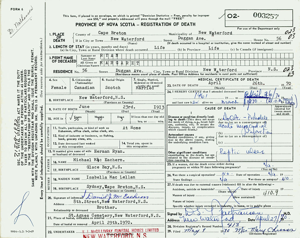 1. PLACE OF DEATH County of Cape Breton If in City or Town New Waterford