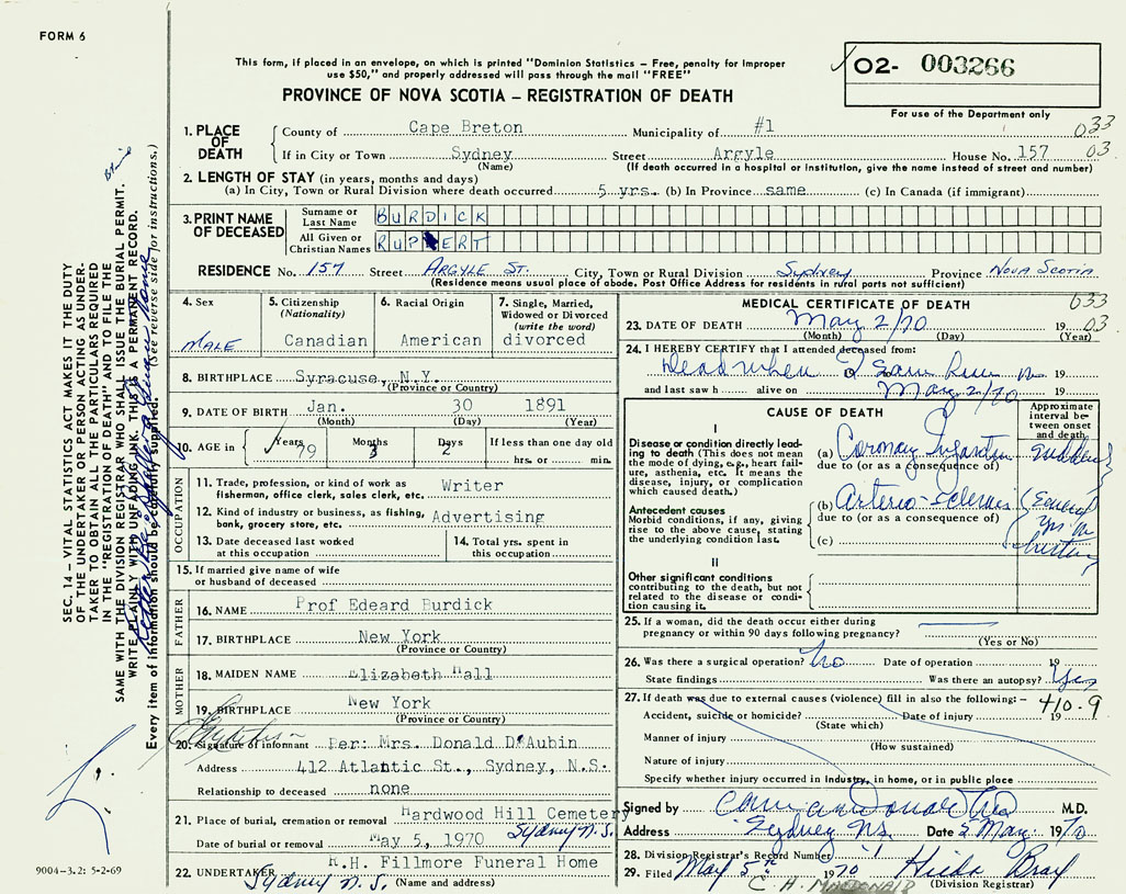 PROVINCE OF NOVA SCOTIA — REGISTRATION OF DEATH