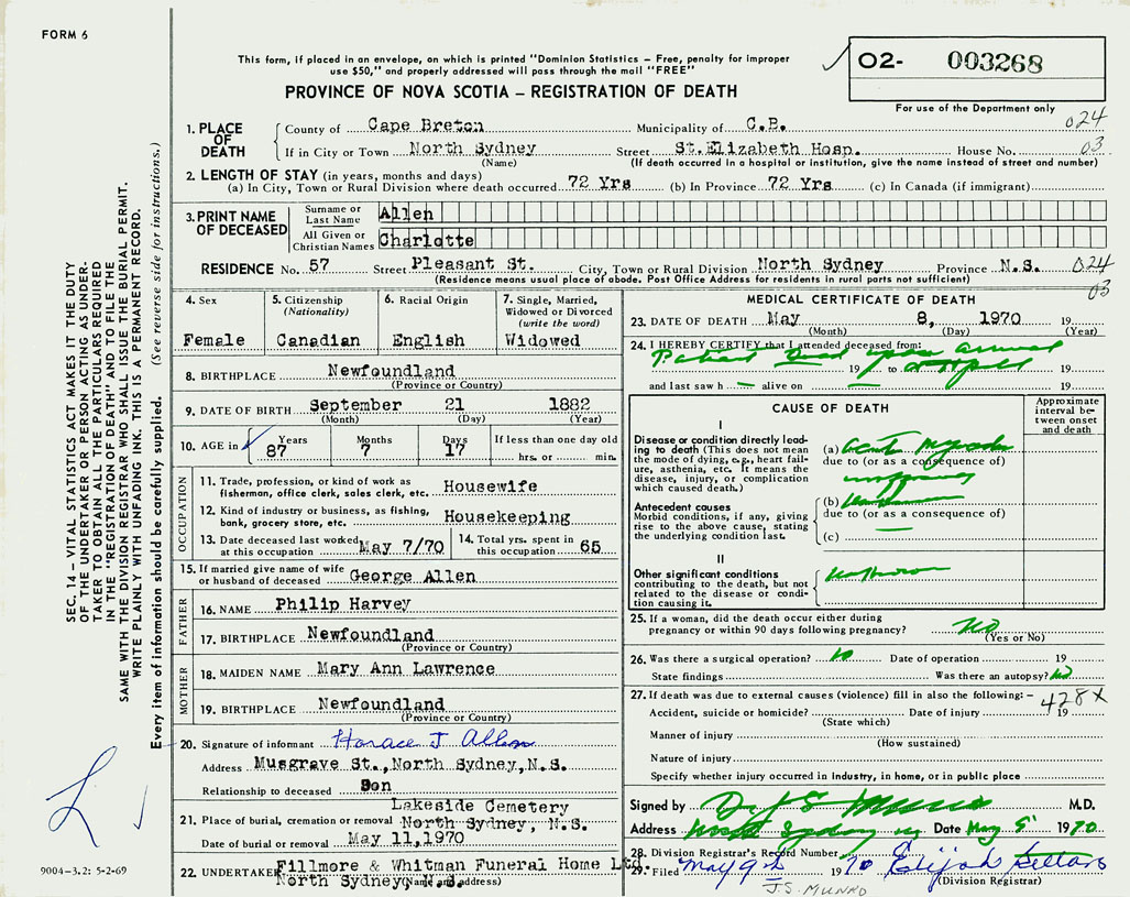 1. PLACE OF DEATH County of Cape Breton If in City or Town North Sydney