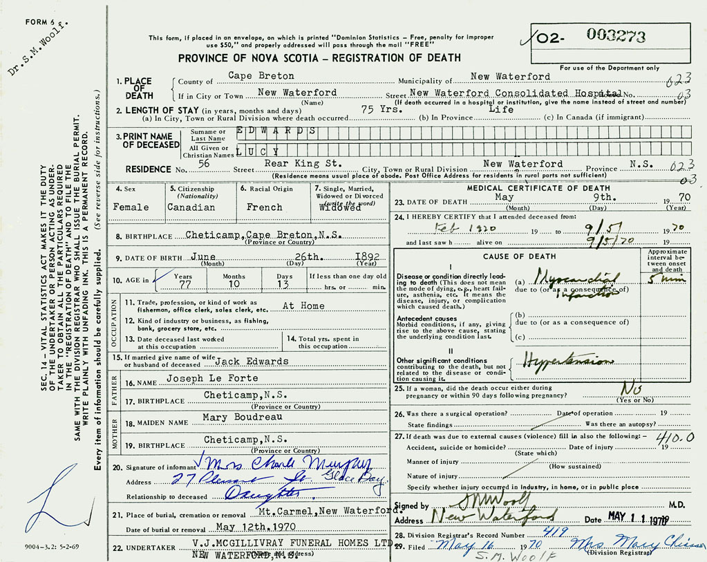 1. PLACE OF DEATH County of Cape Breton If in City or Town New Waterford