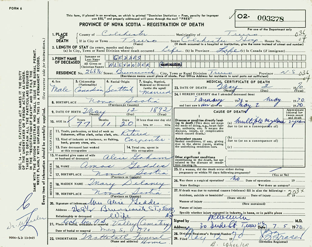 PROVINCE OF NOVA SCOTIA — REGISTRATION OF DEATH