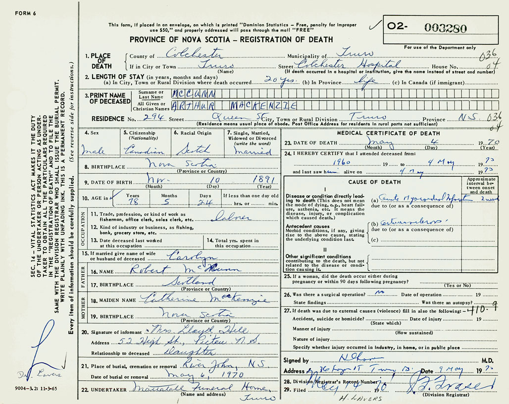 PROVINCE OF NOVA SCOTIA — REGISTRATION OF DEATH