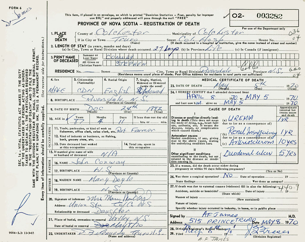 PROVINCE OF NOVA SCOTIA — REGISTRATION OF DEATH
