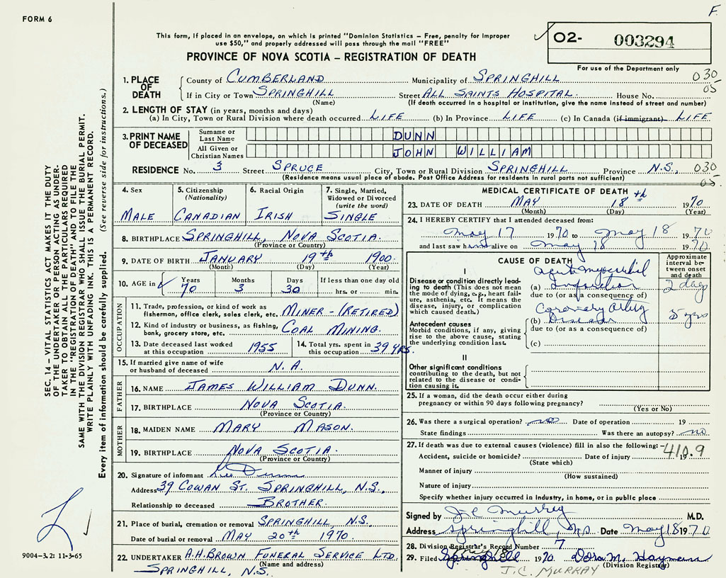 PROVINCE OF NOVA SCOTIA — REGISTRATION OF DEATH