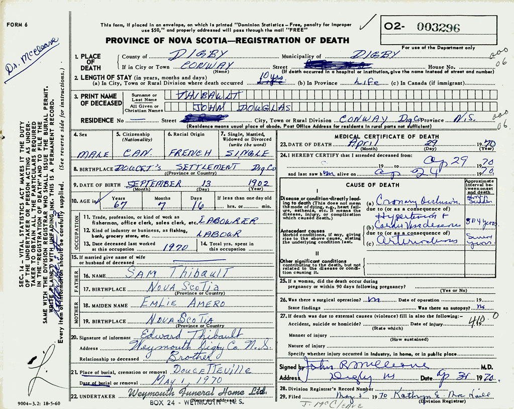 PROVINCE OF NOVA SCOTIA — REGISTRATION OF DEATH