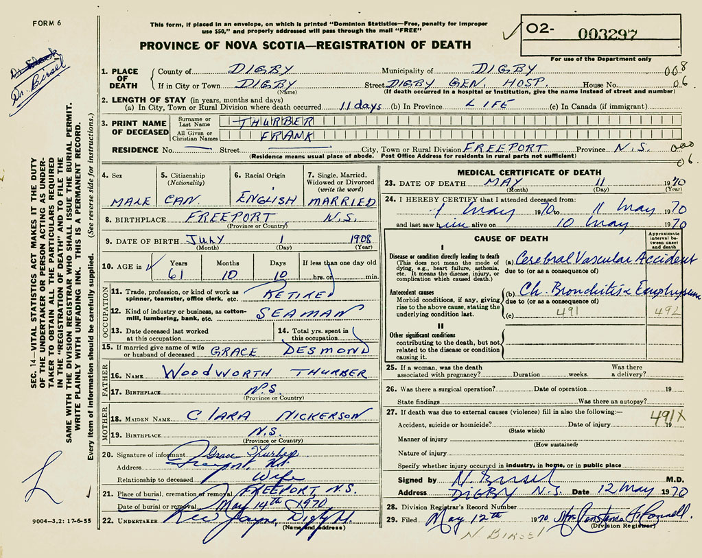 21. Place of burial Freeport, NS
